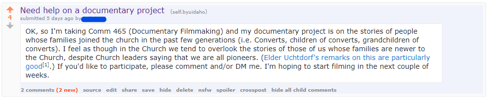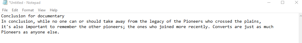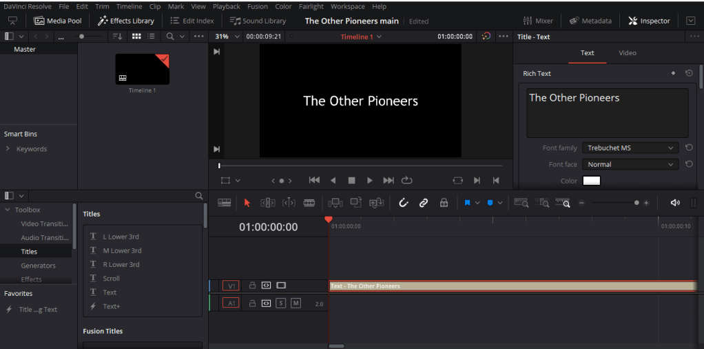 So, for my Comm 465 class, I’m doing a documentary. My topic I’ve chosen is on members of The Church of Jesus Christ of Latter-day Saints who don’t have ancestors who crossed the plains. I’ve titled it, “The Other Pioneers.” I’ve started putting together the project in DaVinci Resolve, putting in the title and a disclaimer that the documentary is not meant to detract from the accomplishments of the more traditional Pioneers (i.e. The ones who crossed the plains). I’m doing this because, as a member of the Church who doesn’t have a direct line that crossed the plains, I feel those of us who don’t have that direct ancestry have our stories overlooked at times, despite various Church leaders saying that the Pioneer heritage is for everyone and those who join the Church are just as much Pioneers. I look forward to sharing some stories of others.